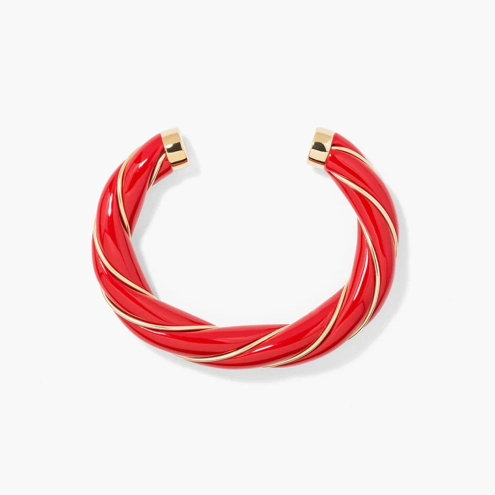 Twisted Diana bangle in red resin, gilded with 750/1000 yellow gold.