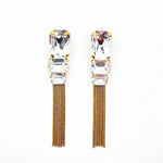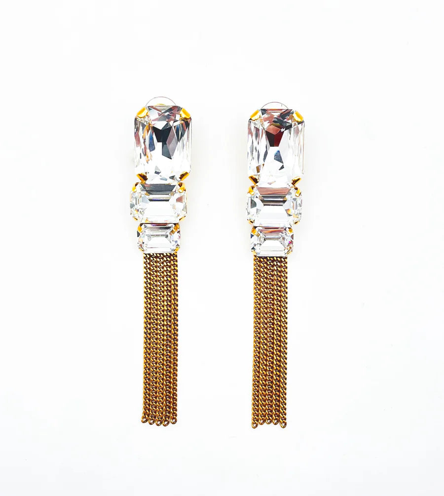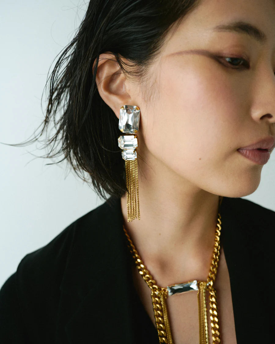 Clip-on earrings in lightly patinated brass with decorative crystals.