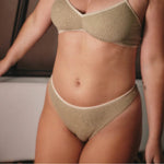 An iconic piece from La Nouvelle, the Georgia briefs have become a must-have over the seasons. Comfortable, sexy, and fashionable, they pair perfectly with all the tops in the Georgia line. Gold lurex elastic at the waist.