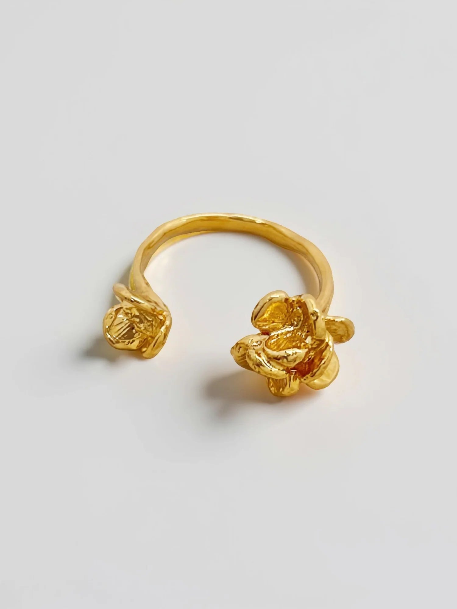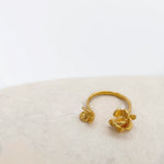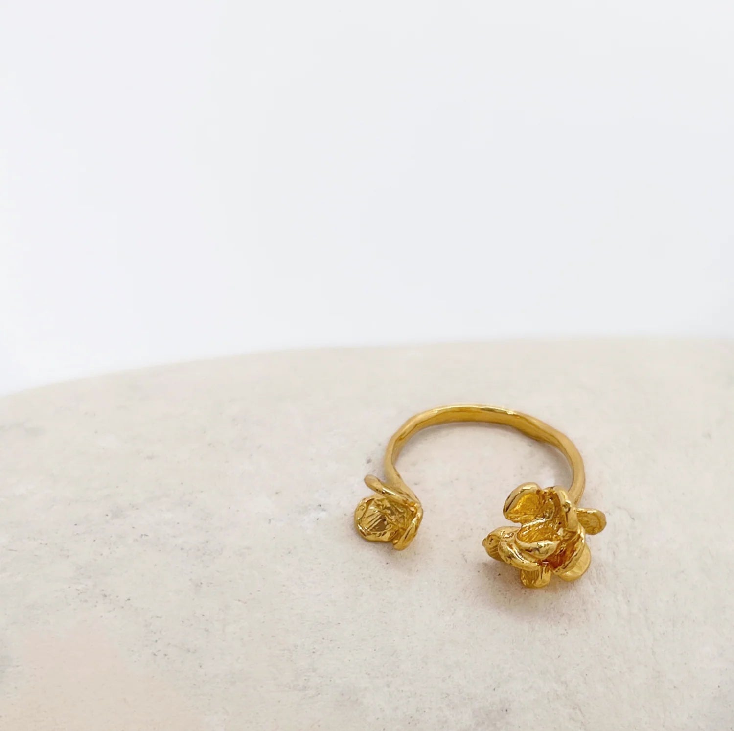 La bague Elba est une pièce réglable réalisée de façon artisanale en France. Terriblement romantique, captant la lumière, cette pièce solaire aux lignes florales habillera délicatement votre main.