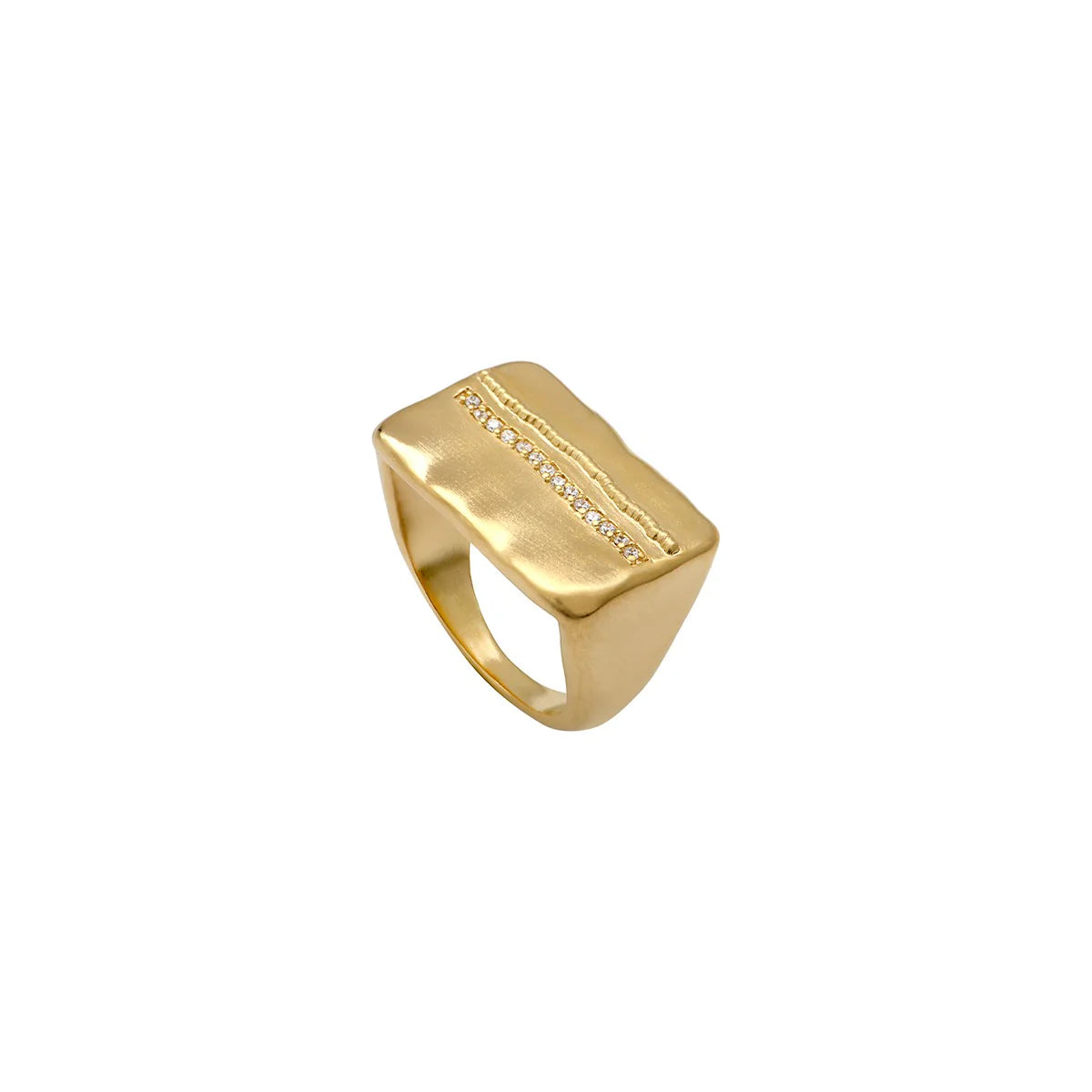 Bague chevalière rectangulaire avec ses angles arrondis pavée d’une ligne irrégulière de zircons blancs et de mini billes en plaqué or 3 microns