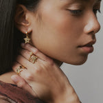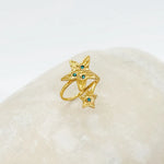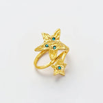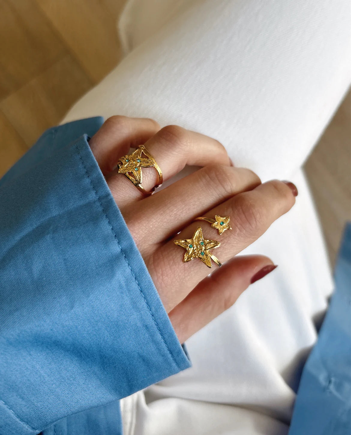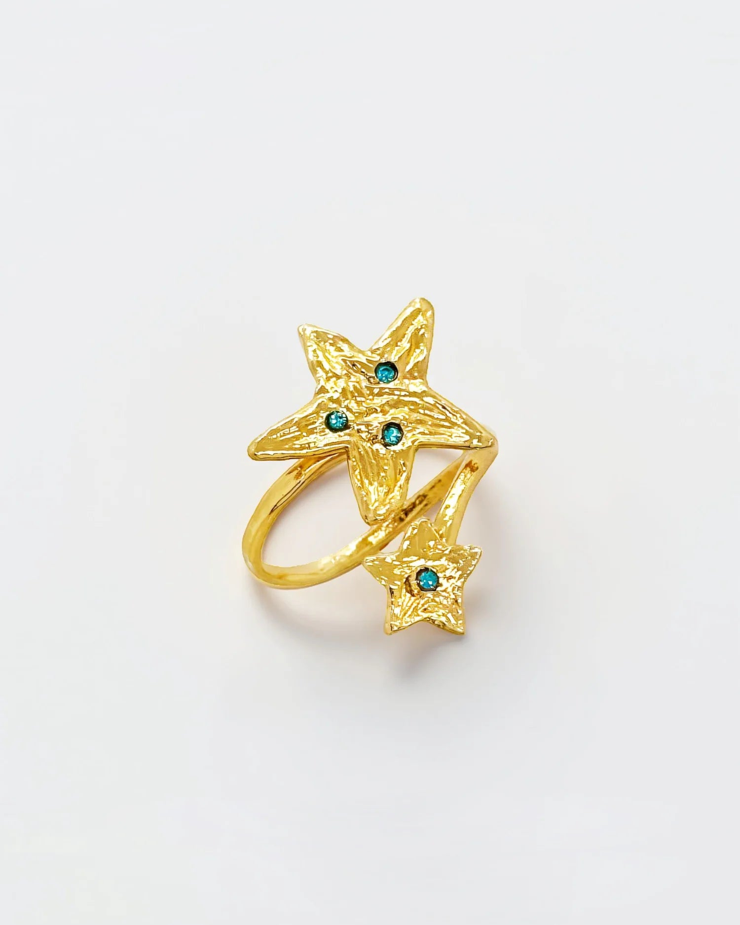La bague Kyle, fabriquée à Paris, évoque l'éclat des étoiles avec son design doré texturé et ses cristaux scintillants. Ajustable et raffinée, elle apporte une touche lumineuse et élégante à votre main.