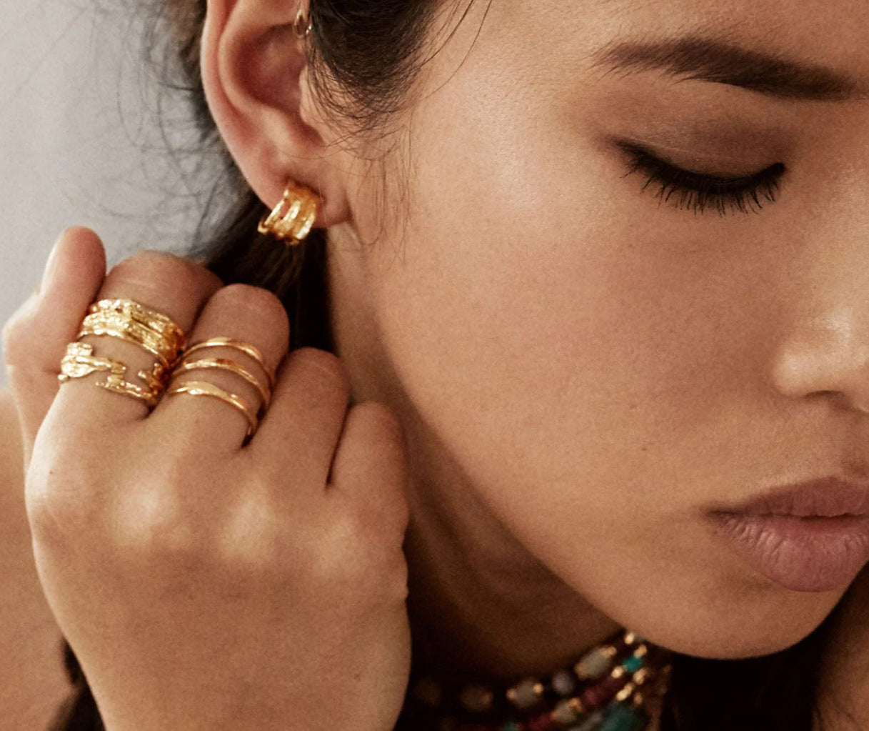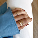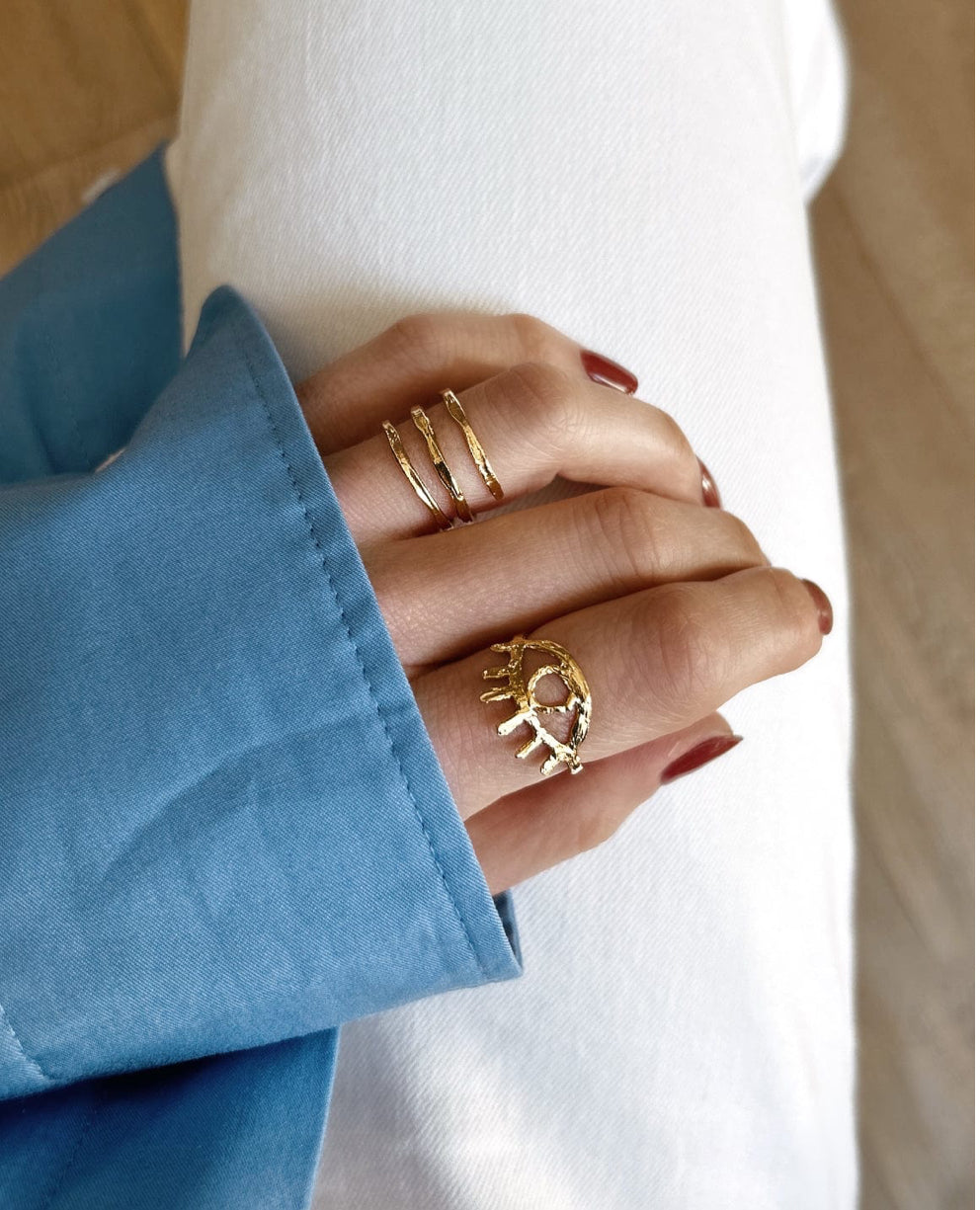 Fabriquée à Paris, la bague Surate aux anneaux imparfaits et fini texturé, habillera tout en élégance vos mains.