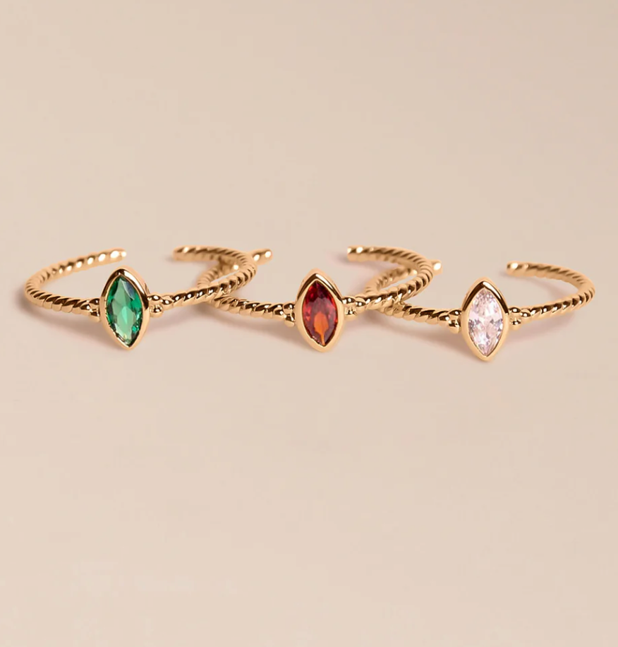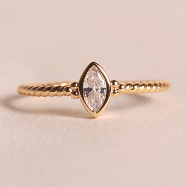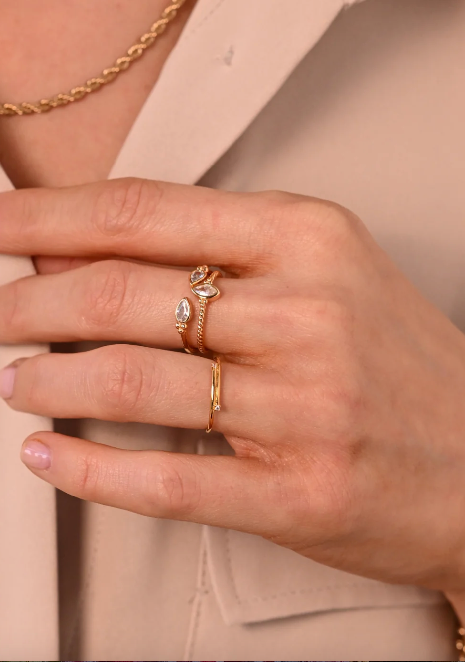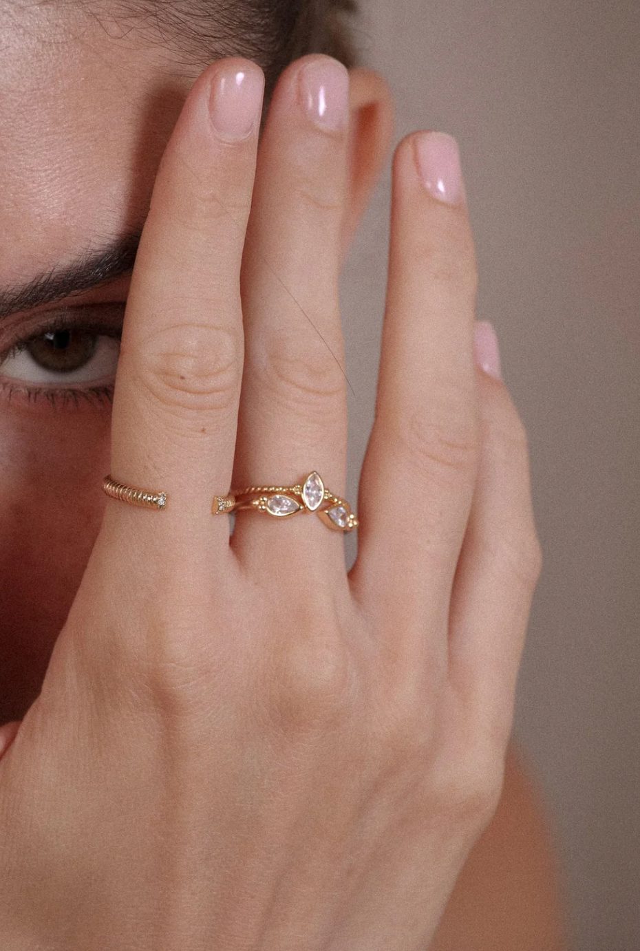 Découvrez le modèle Wilma à l'inspiration vintage avec son zircon ovale. Une bague fine réglable, parfaite à accumuler avec notre modèle Alma. En plaqué or 3 microns.