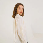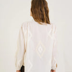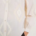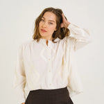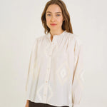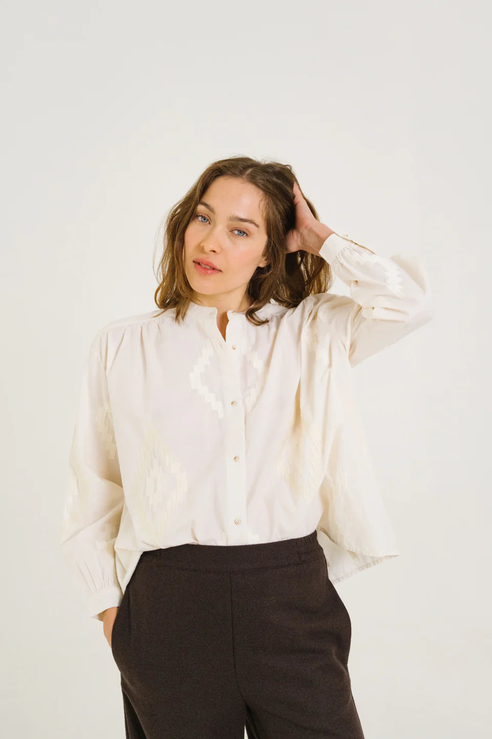 Blouse féminine à manches longues écru avec broderies ton sur ton.