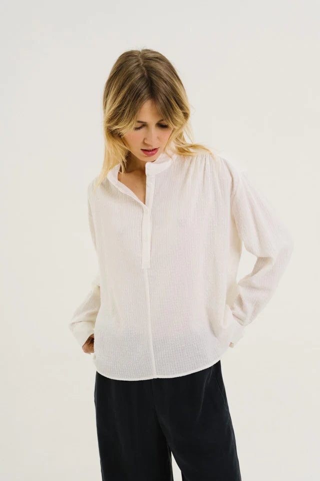 Blouse à col montant, confectionnée dans un mélange de coton et viscose à petit carreau texturé ton sur ton.