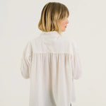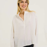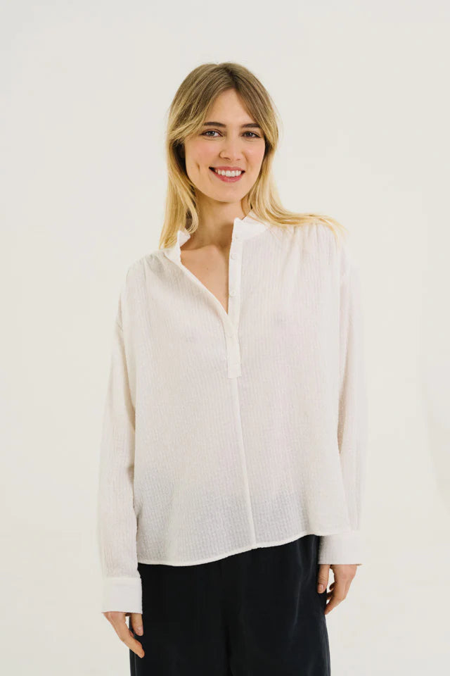 Froncée à l’avant et au dos, elle est soulignée par une patte polo et des bas de manches fermés par un bouton, pour une finition subtilement féminine.