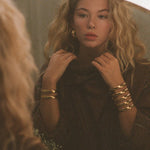 Les Boucles d'oreilles Nazca en résine couleur ivoire et en laiton martelé évoquent par leurs lignes et leur volume les ornements incas. Détail doré à l'or jaune 750/1000.