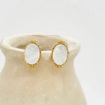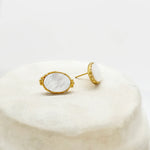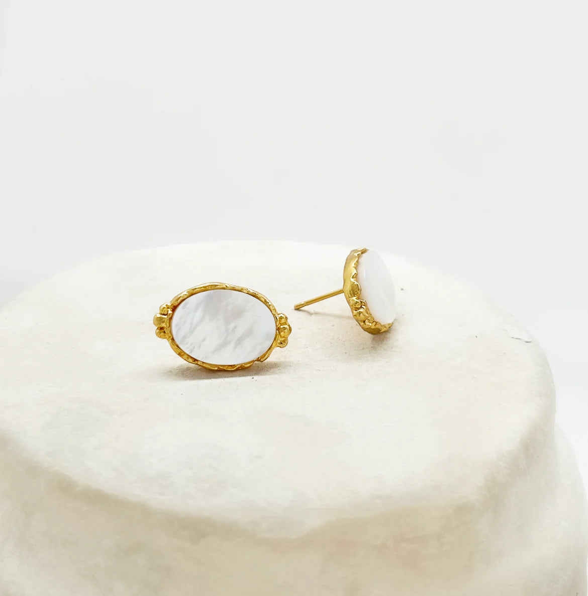 Alliance de précieux et de délicatesse, ces boucles d’oreilles Panagia, façon puces d'oreilles sont parées de délicates pierres naturelle, Nacre blanches ou Turquoise d'Afrique. Cette pièce intemporelle aux formes imparfaites ne vous quittera plus.