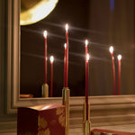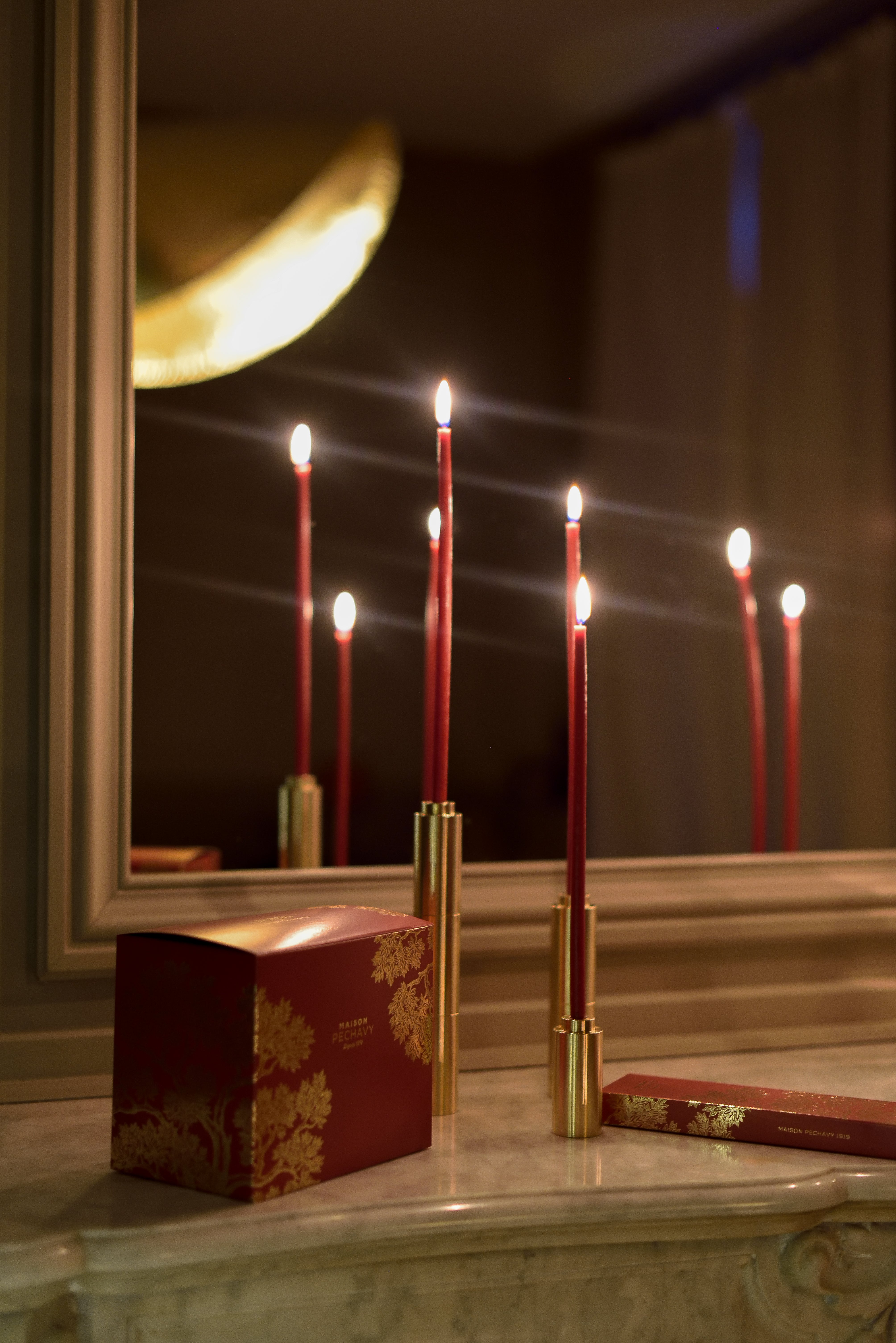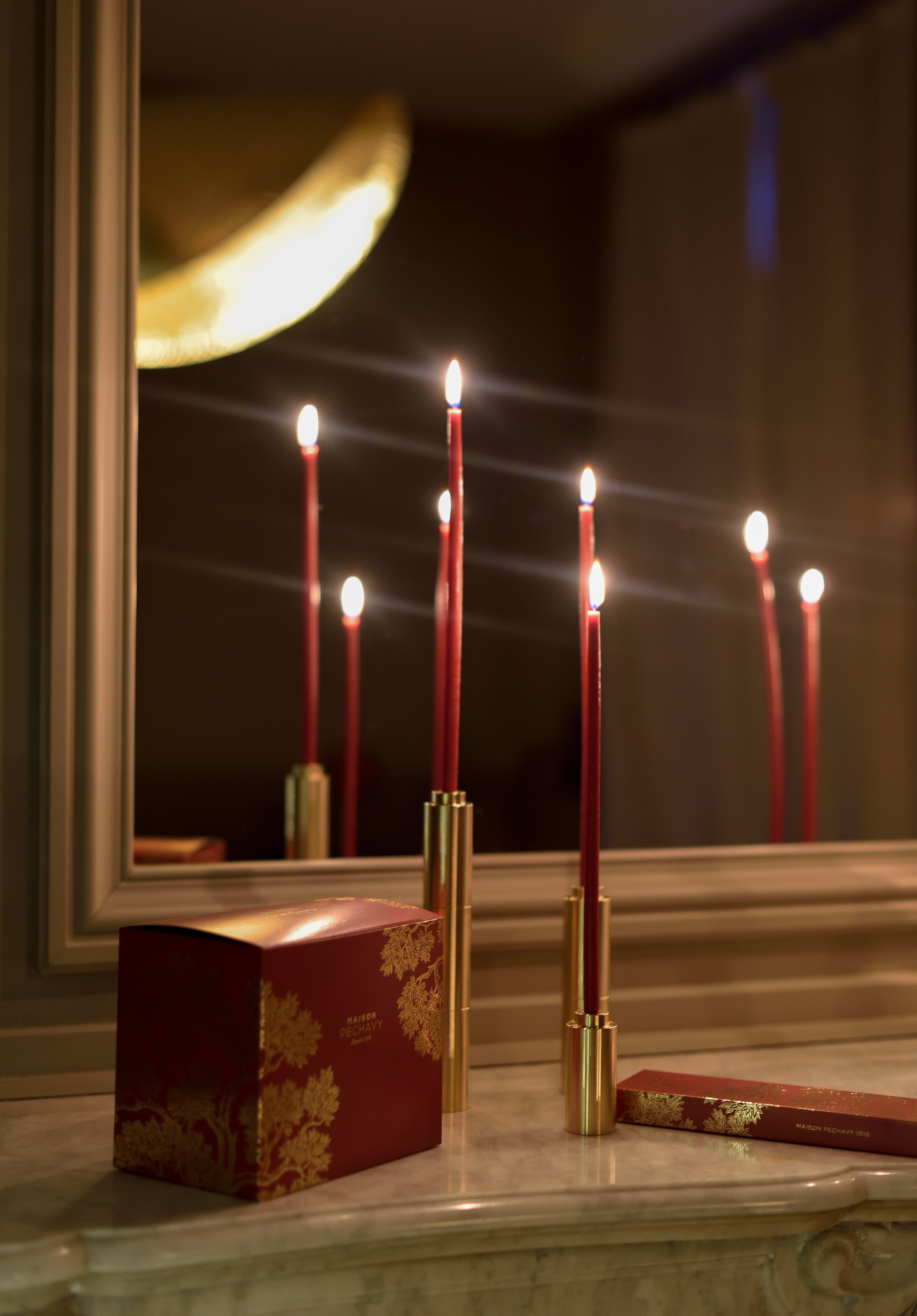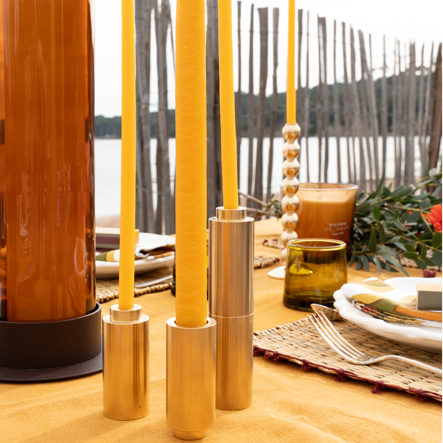 Ce porte-bougie en laiton doré magnifie les bougies colorées faites artisanalement par une manufacture de cierges labellisée EPV (Entreprise du Patrimoine Vivant).
