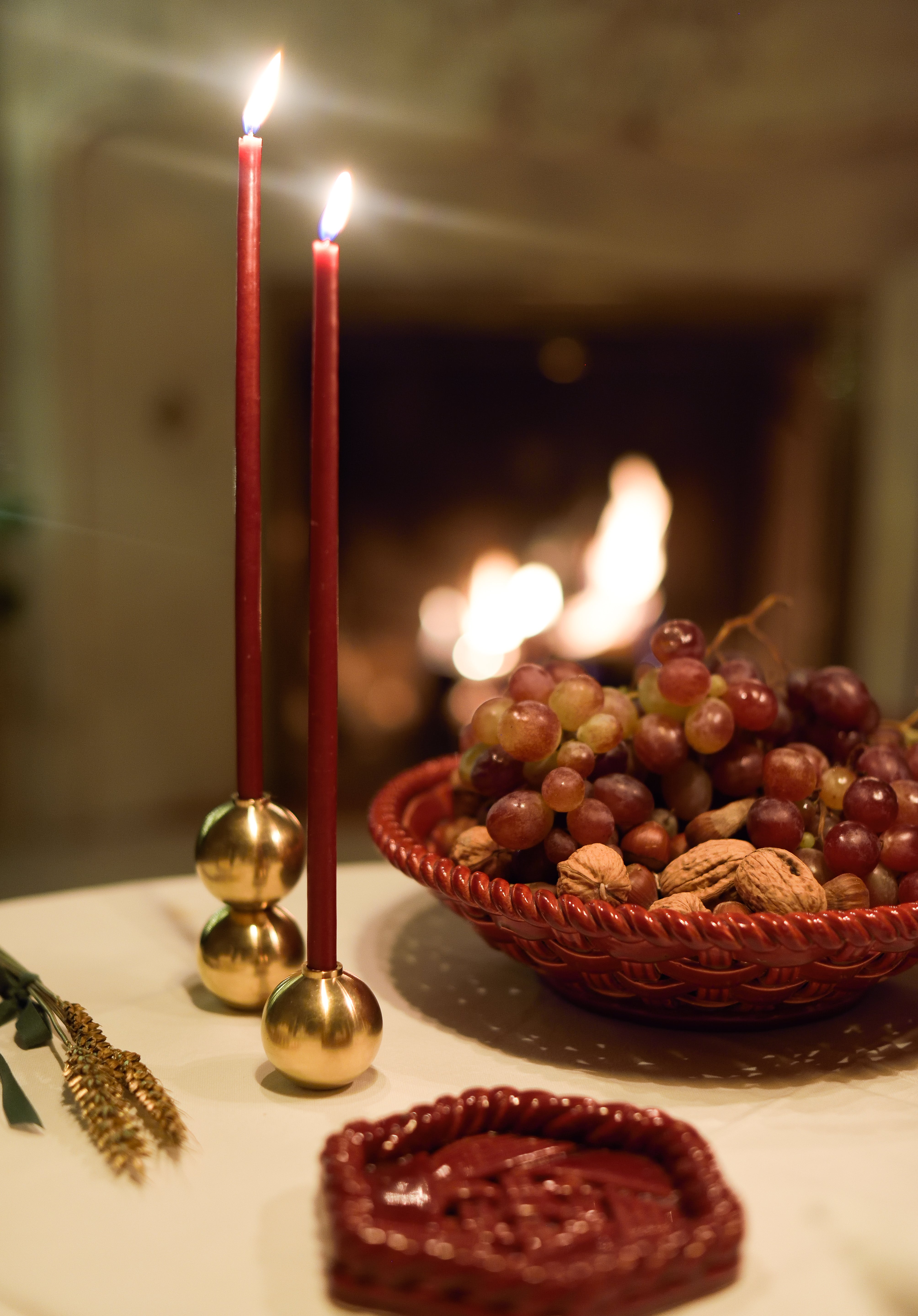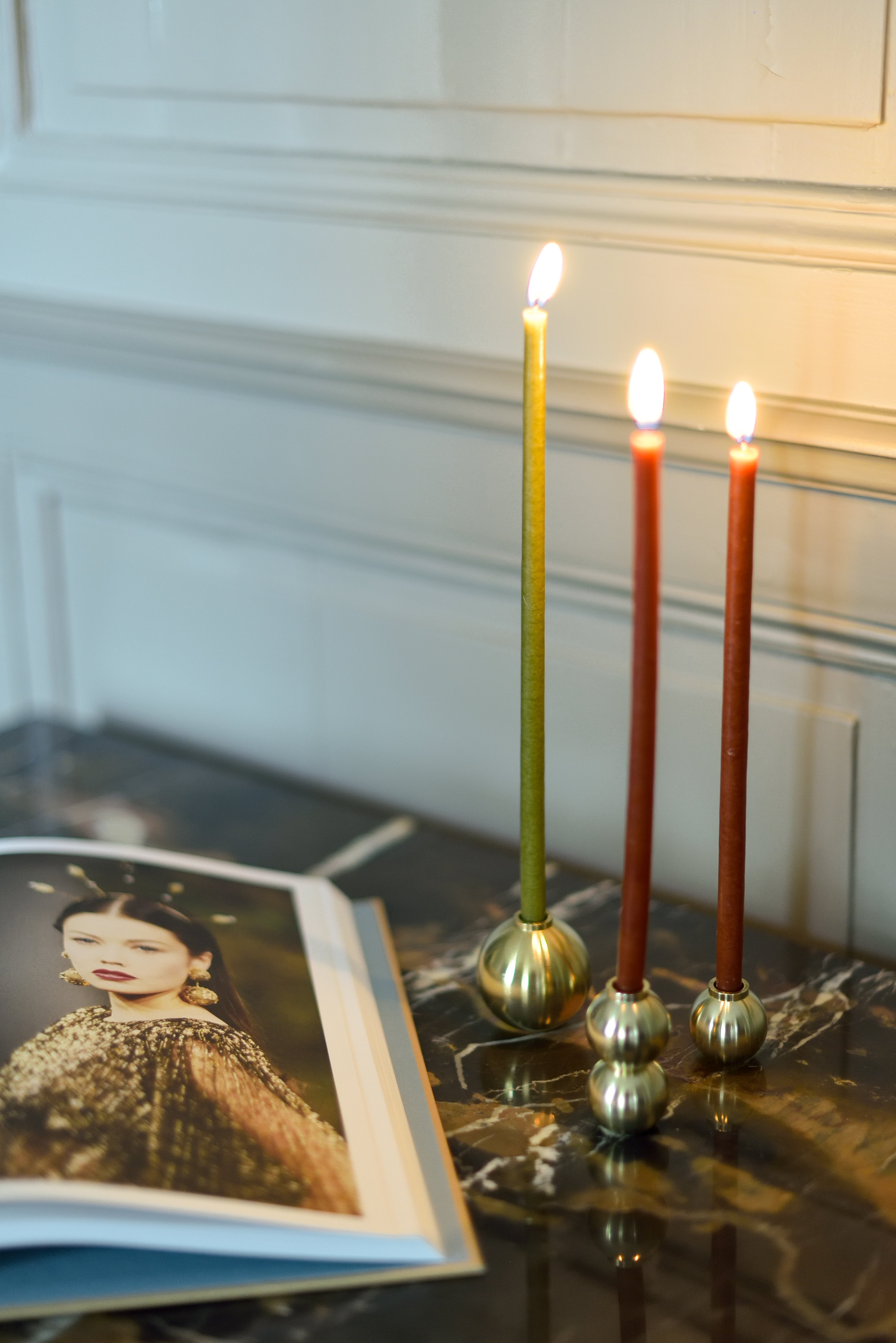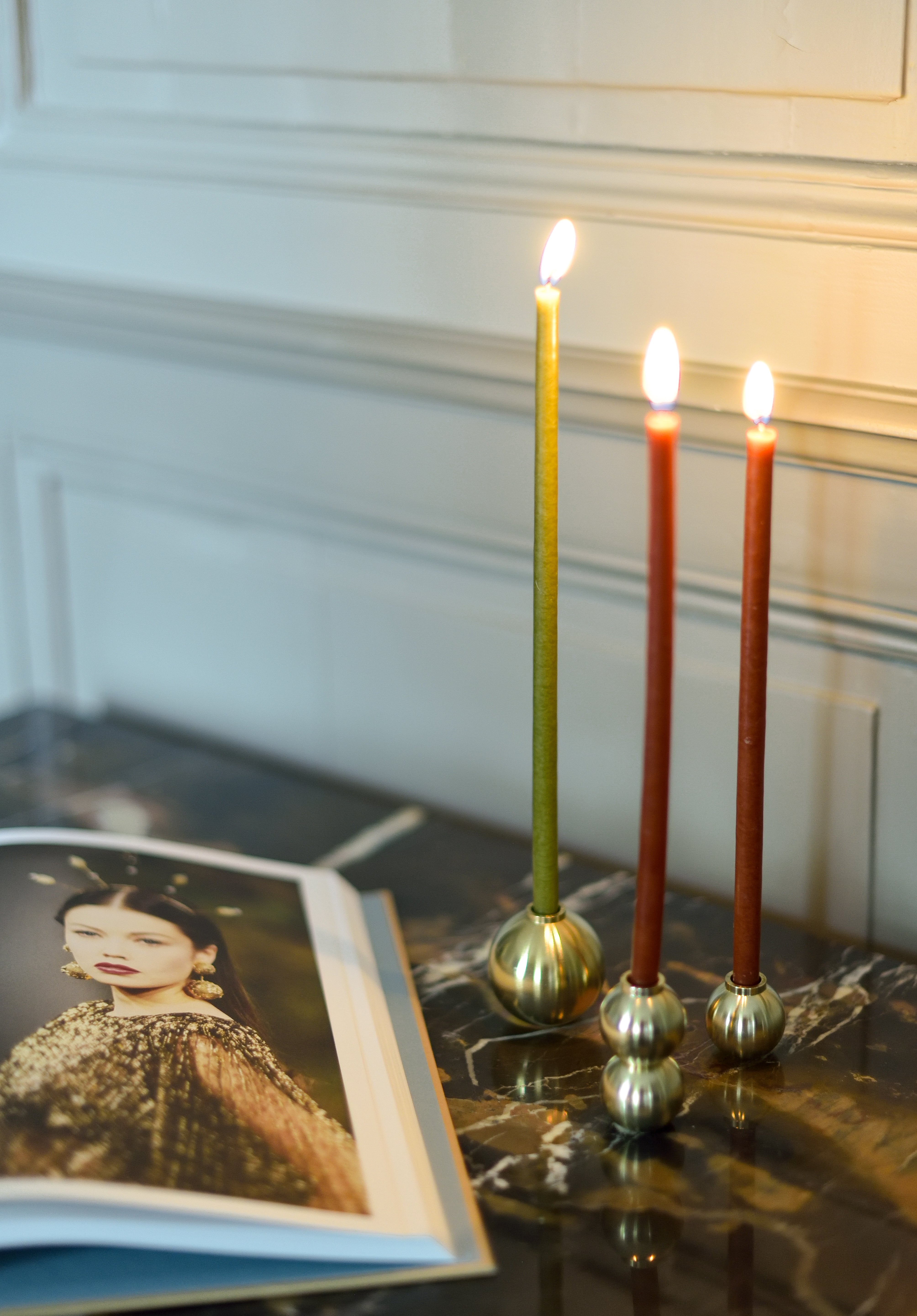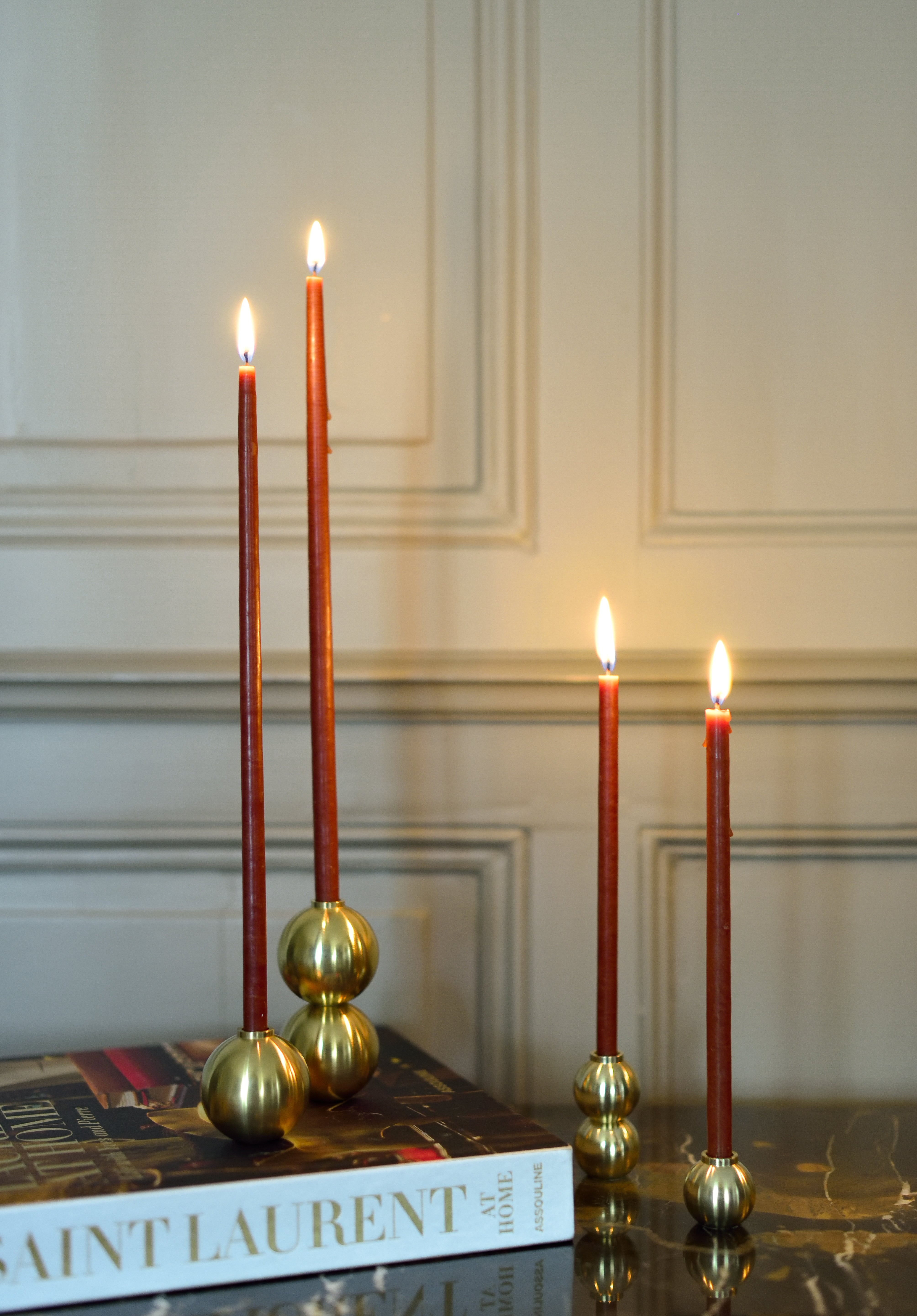 Rond et généreux, le bougeoir SPHÈRE se marie à merveille avec le duo de bougeoir GEMMES et le bougeoir haut nommé PERLES.