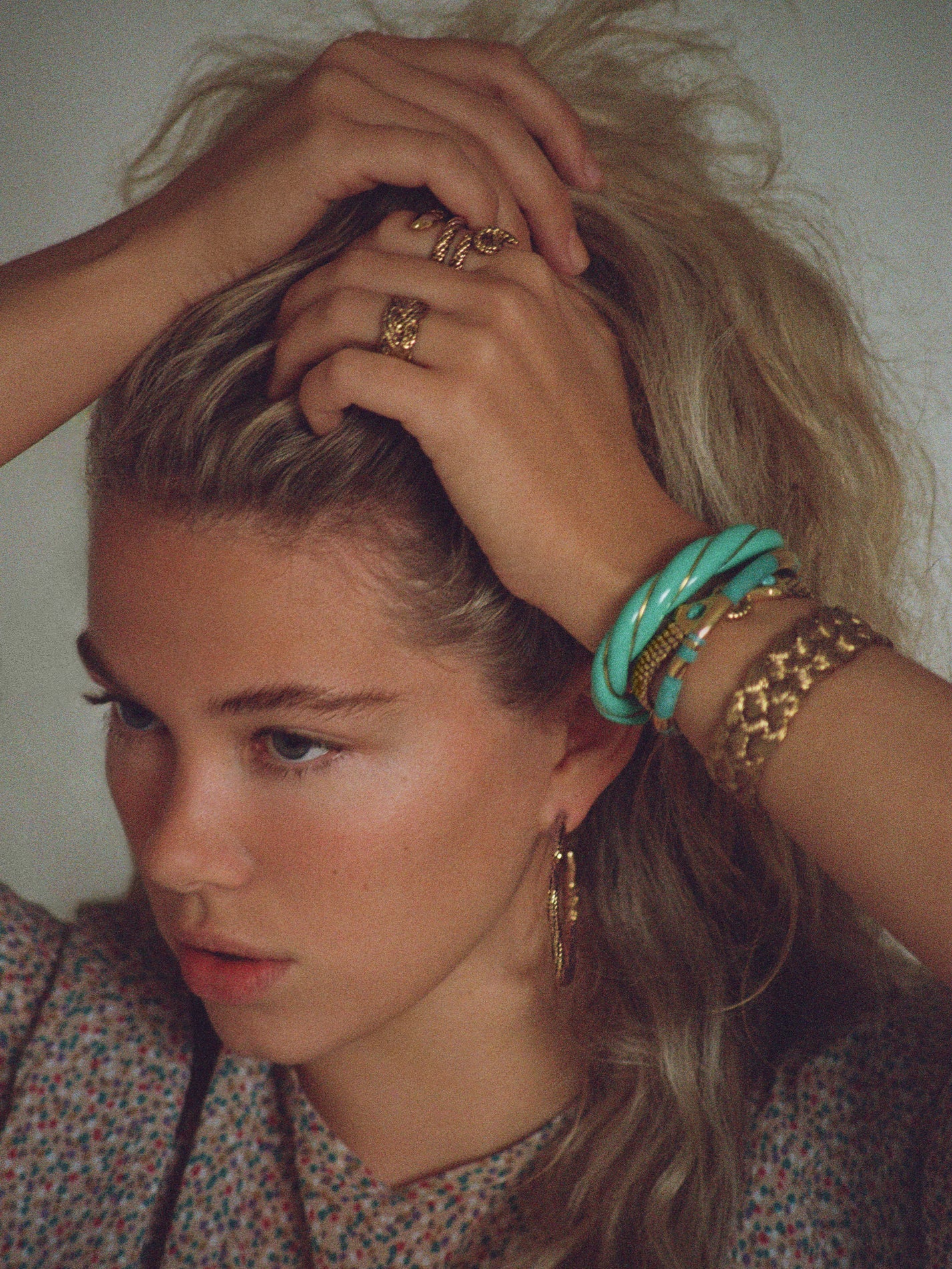 Ce goût des grands classiques dans la mode se poursuit avec Grisell, qui multiplie au format de manchette, bracelet, bague, pendants d’oreilles la culture du tricot, qui fut longtemps celles des femmes de pêcheurs sur les rivages de l’île d’Albion.