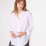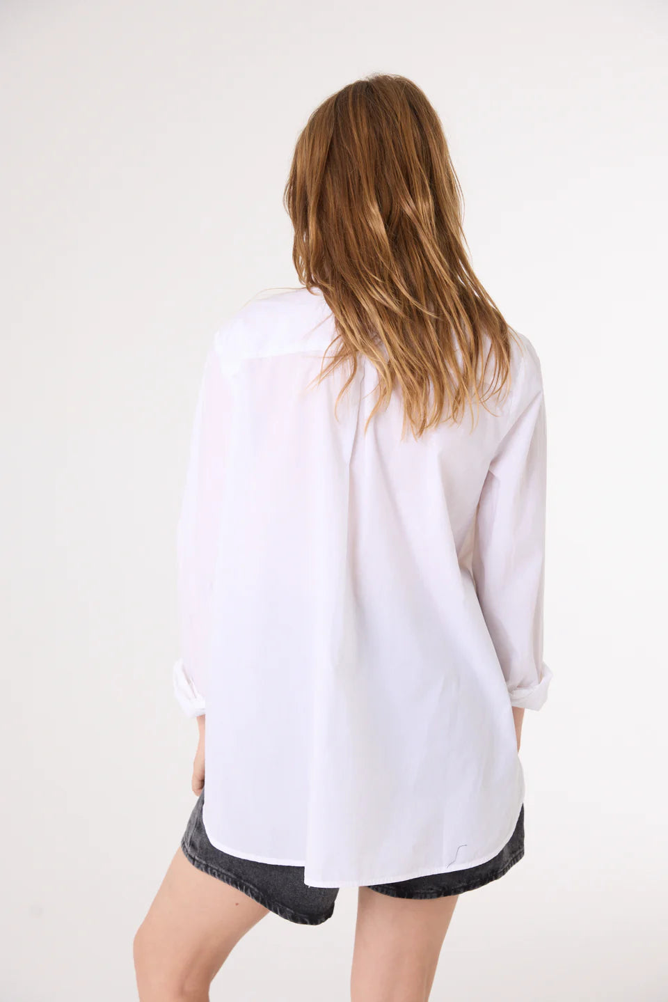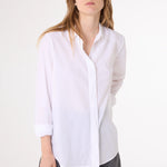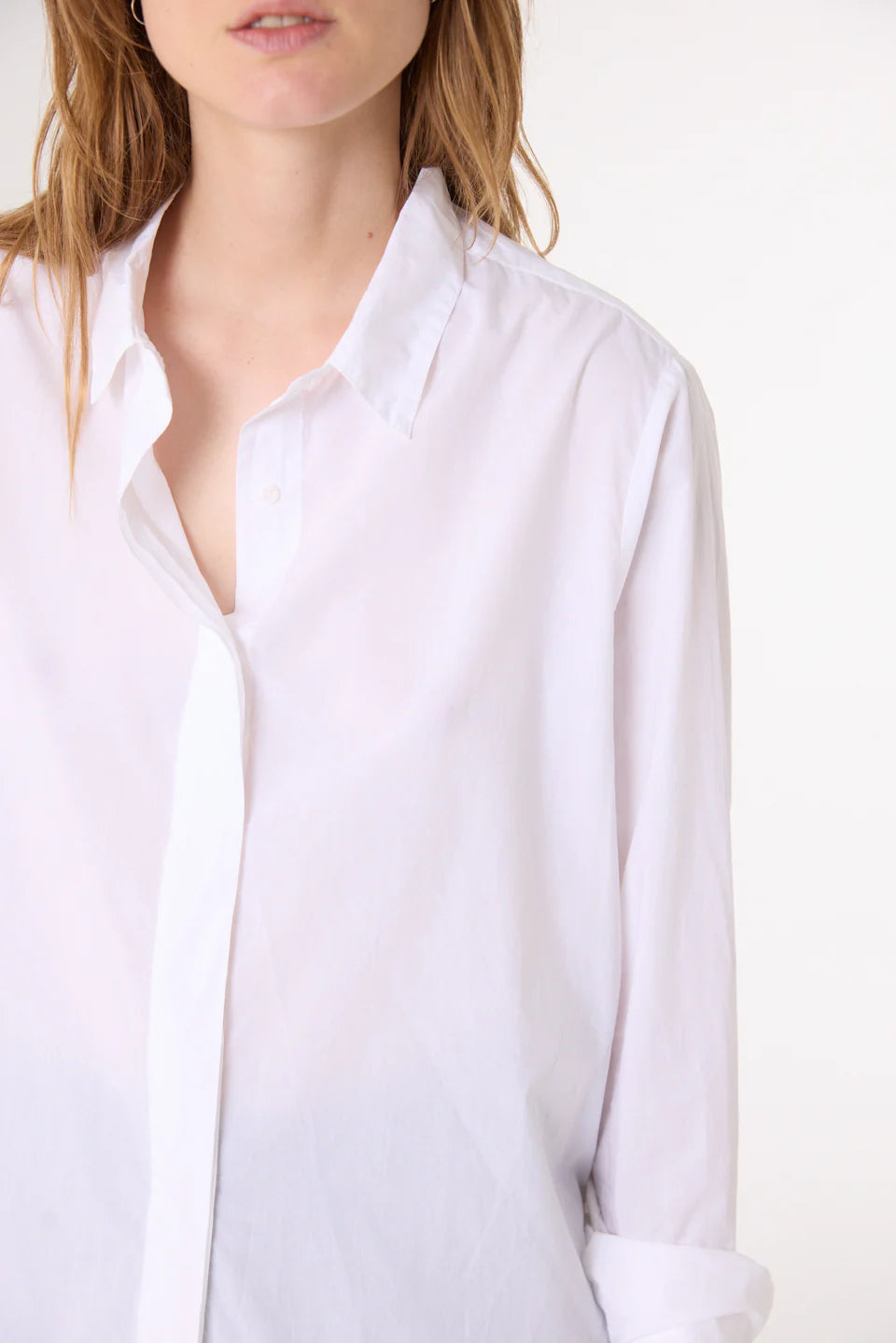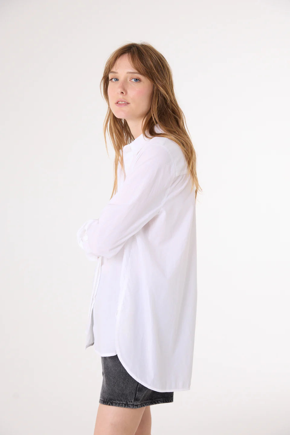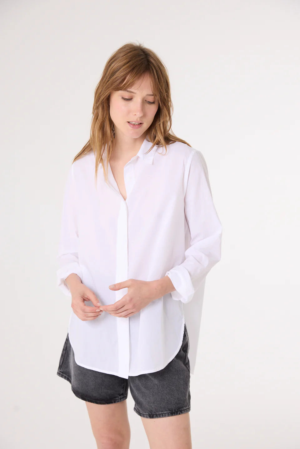 Chemise à manches longues, confectionnée en popeline fine de coton. Sa coupe ample est rehaussée par un col chemise classique et un boutonnage caché pour une allure épurée. Son empiècement au dos et son large pli ajoutent structure et fluidité. Poignets boutonnés et patte capucin en finition.