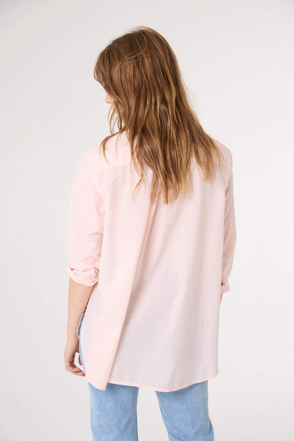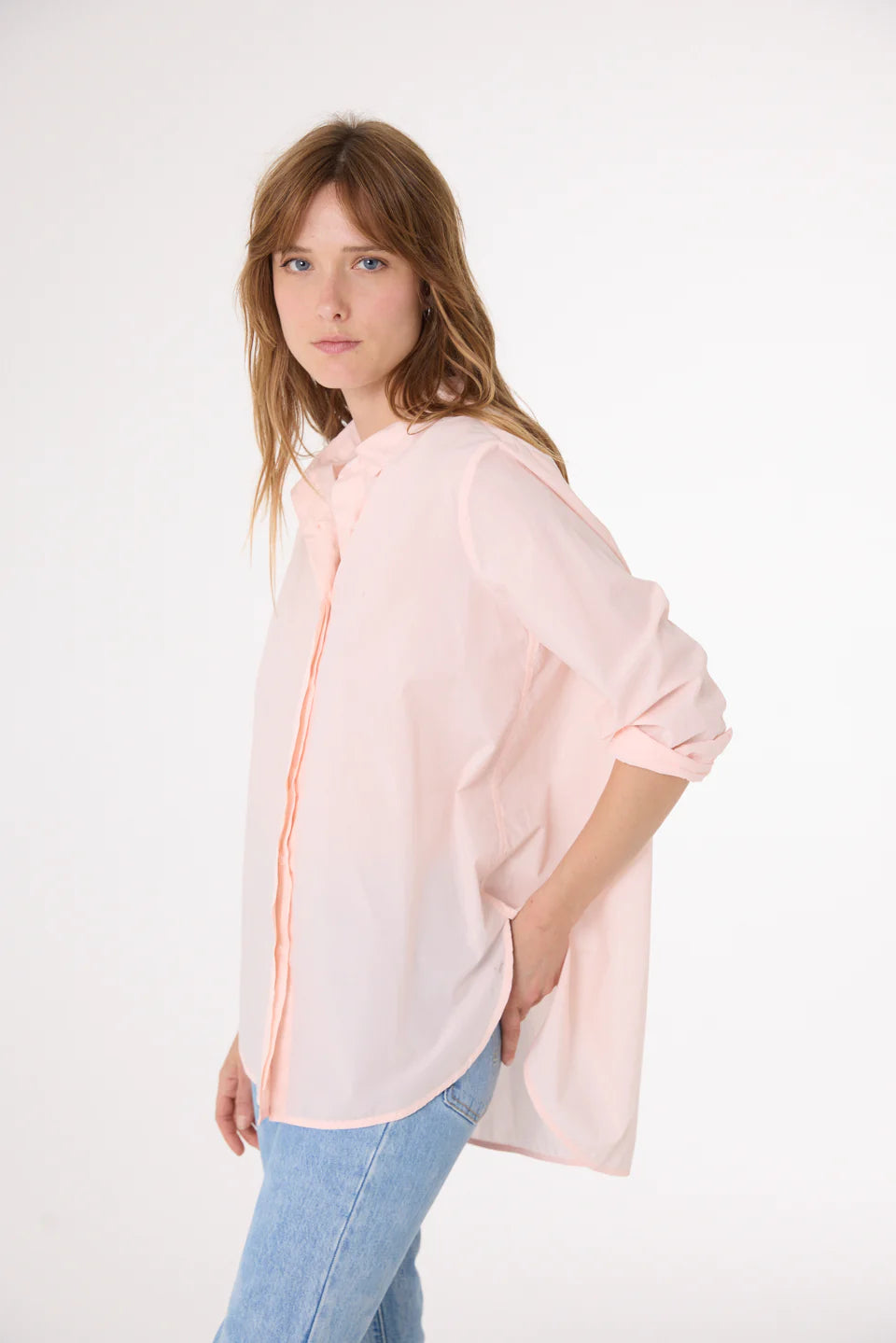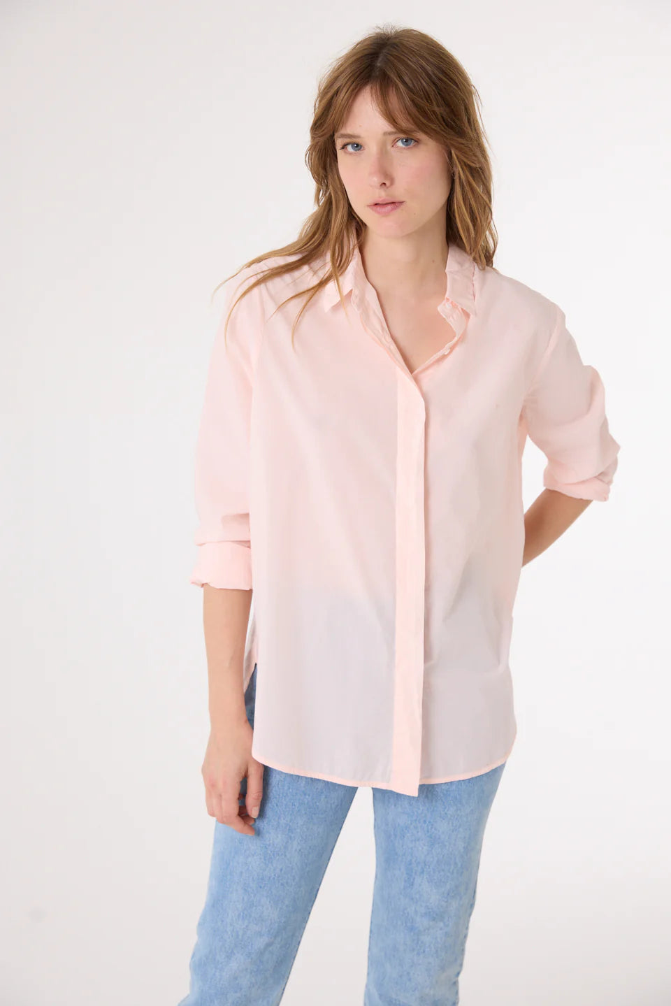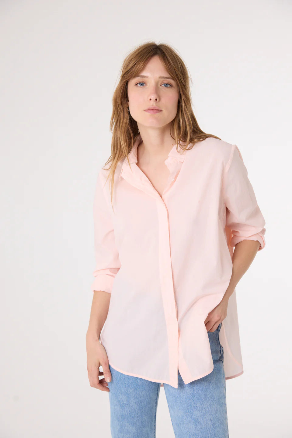 Chemise à manches longues, confectionnée en popeline fine de coton. Sa coupe ample est rehaussée par un col chemise classique et un boutonnage caché pour une allure épurée. Son empiècement au dos et son large pli ajoutent structure et fluidité. Poignets boutonnés et patte capucin en finition.