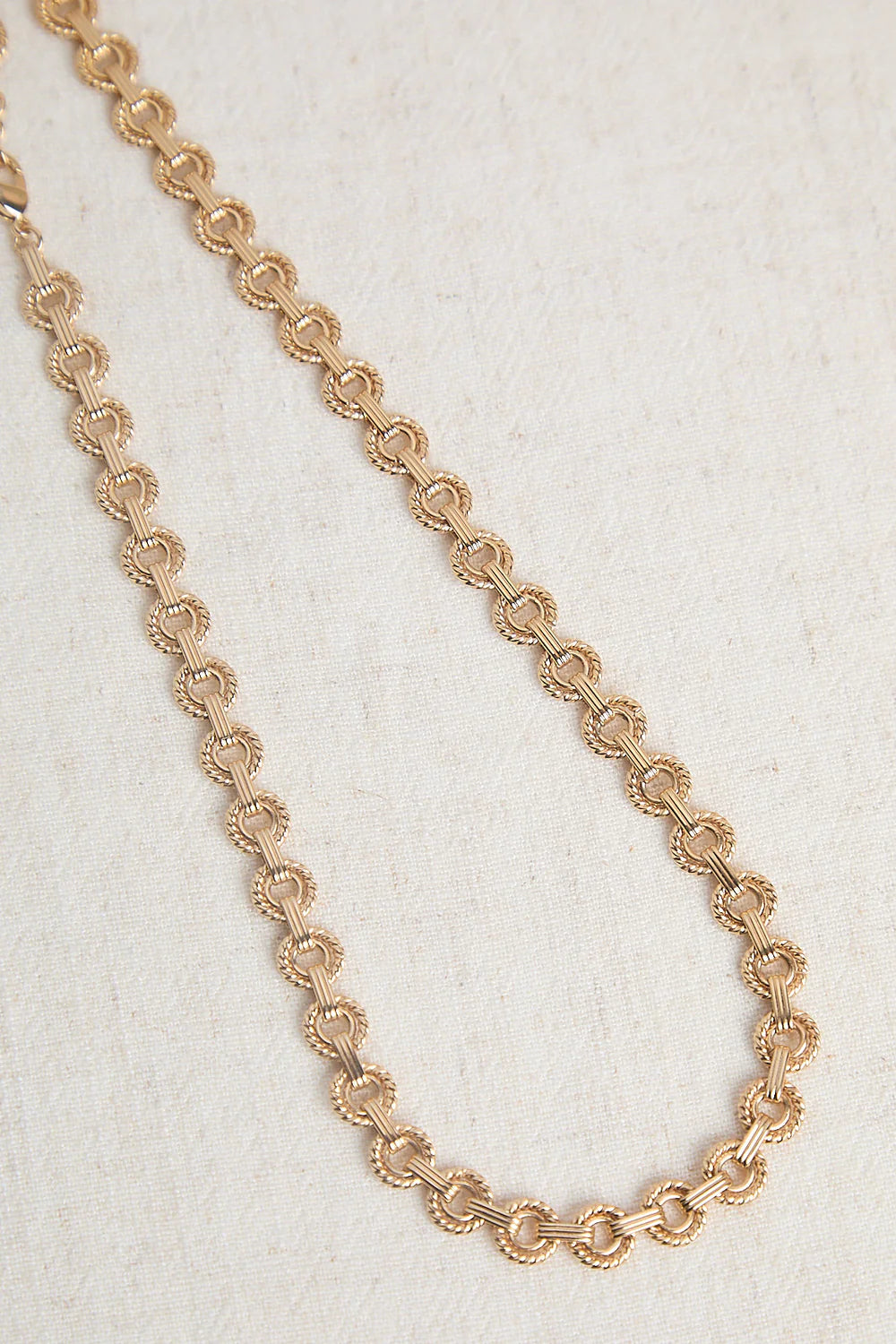 Maille ronde plate aux détails striés. Notre collier Mahan grâce à sa chaine originale ne passera pas inaperçu. Un modèle qui pourra habiller n'importe laquelle de vos tenues.