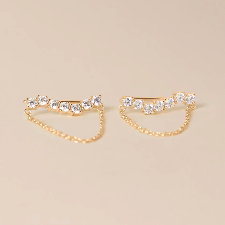 Nos contours Sorentina sont délicatement sertis de zirconiums blancs rehaussés d'une chaine fine pour apporter du mouvement à vos oreilles. Un modèle idéal à offrir.