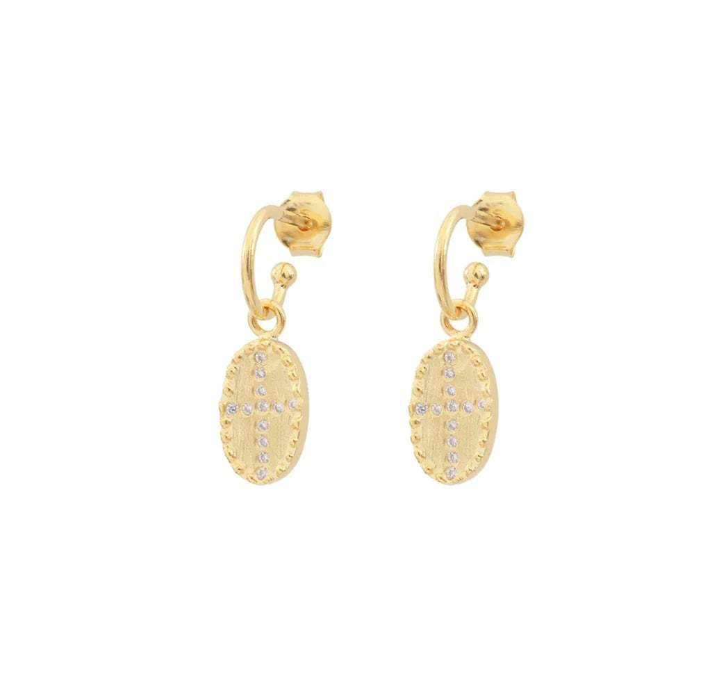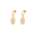 Créole et sa mini médaille ovale de 1cm/0,6cm embossée, sertie de zircons blancs, brossée et mate en plaqué or 3 micron.