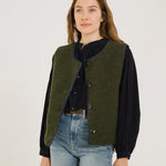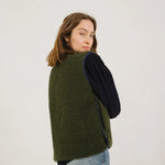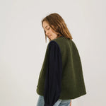 Gilet sans manches en laine bouclette kaki foncé, entièrement doublé pour plus de confort et de tenue. Son col rond et ses finitions en biais contrastant lui apportent une touche graphique et soignée. Doté de poches discrètes dans la couture et d’un bouton apparent, il combine chaleur, élégance et praticité