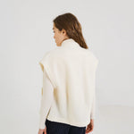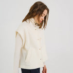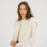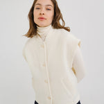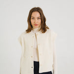 Veste ronde sans manches en laine vierge écru, non doublée pour un porté léger et naturel. Sa coupe oversize est structurée par des pinces dans le bas du dos et sublimée par un col style bomber. Dotée de larges poches passepoilées et d’un boutonnage apparent, elle allie volume, confort et allure contemporaine.