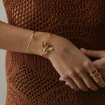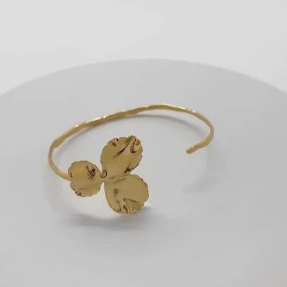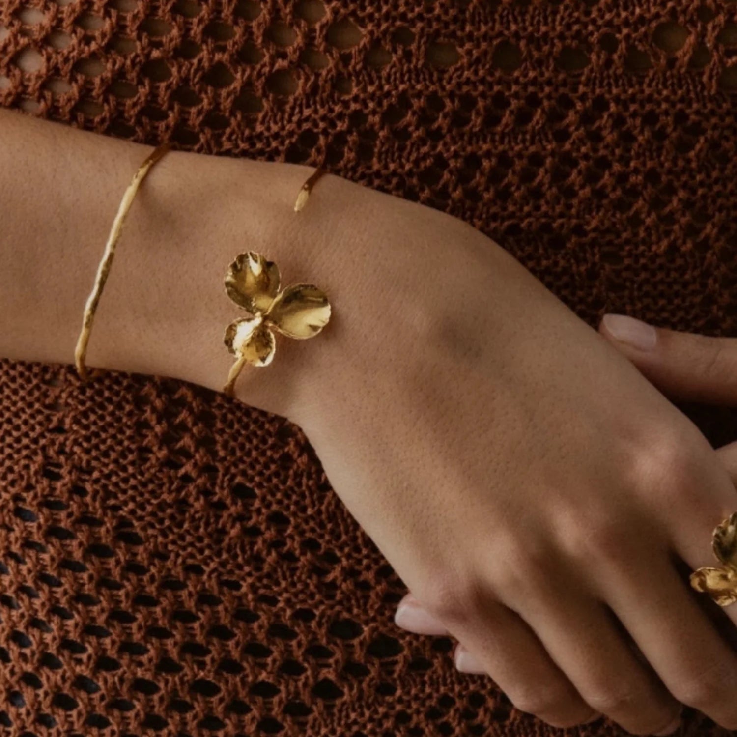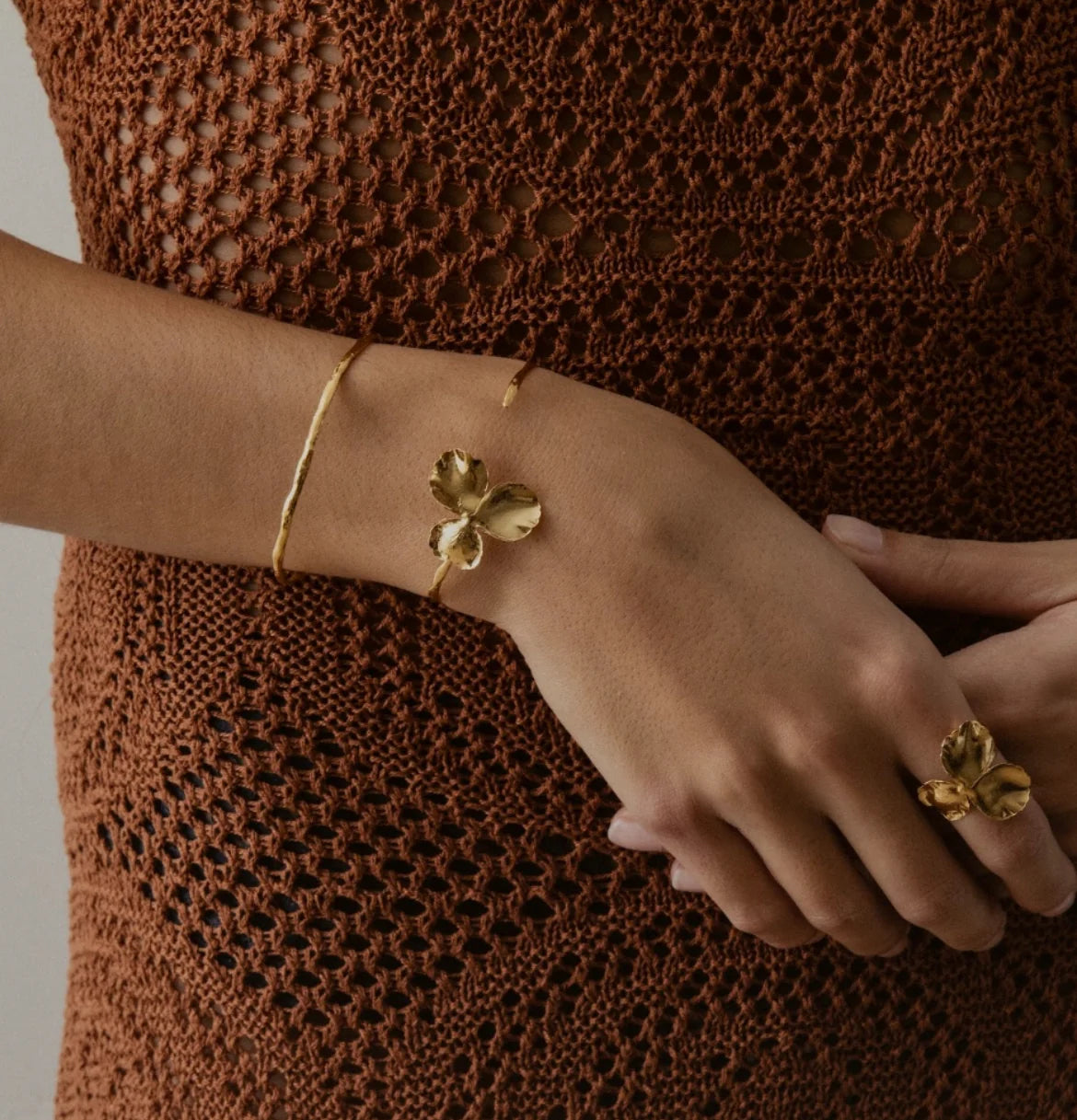 Fabriqué à la main en France, ce jonc ajustable prend la forme délicate d'une fleur de Pensée. Un bijou iconique de notre maison.