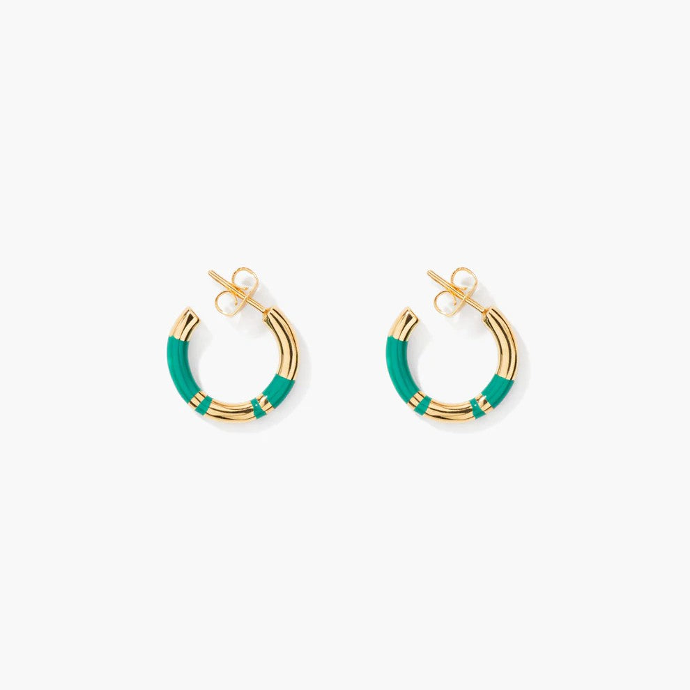 Mini créoles Positano à rayures vert émeraude en résine et dorées à l'or jaune 750/1000.