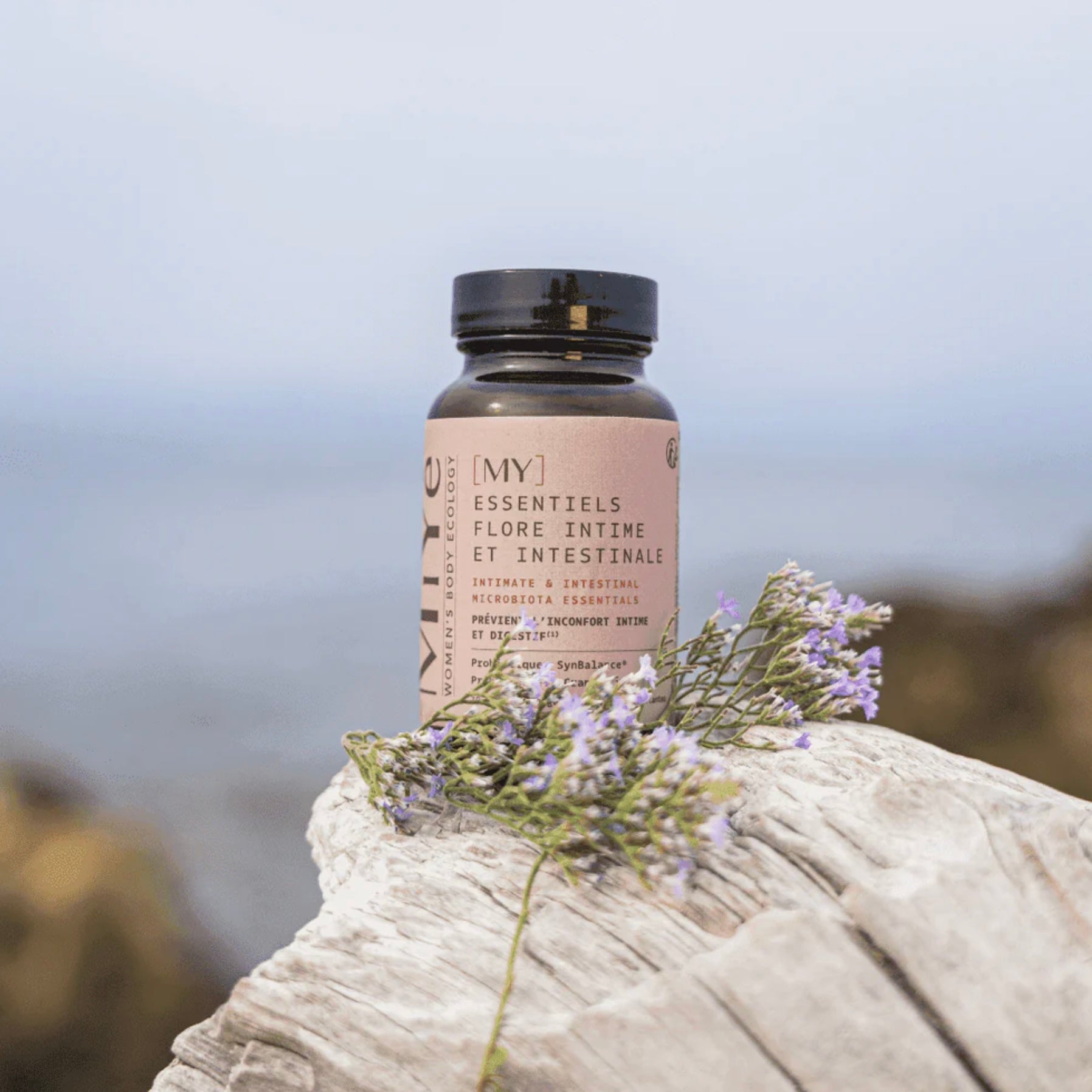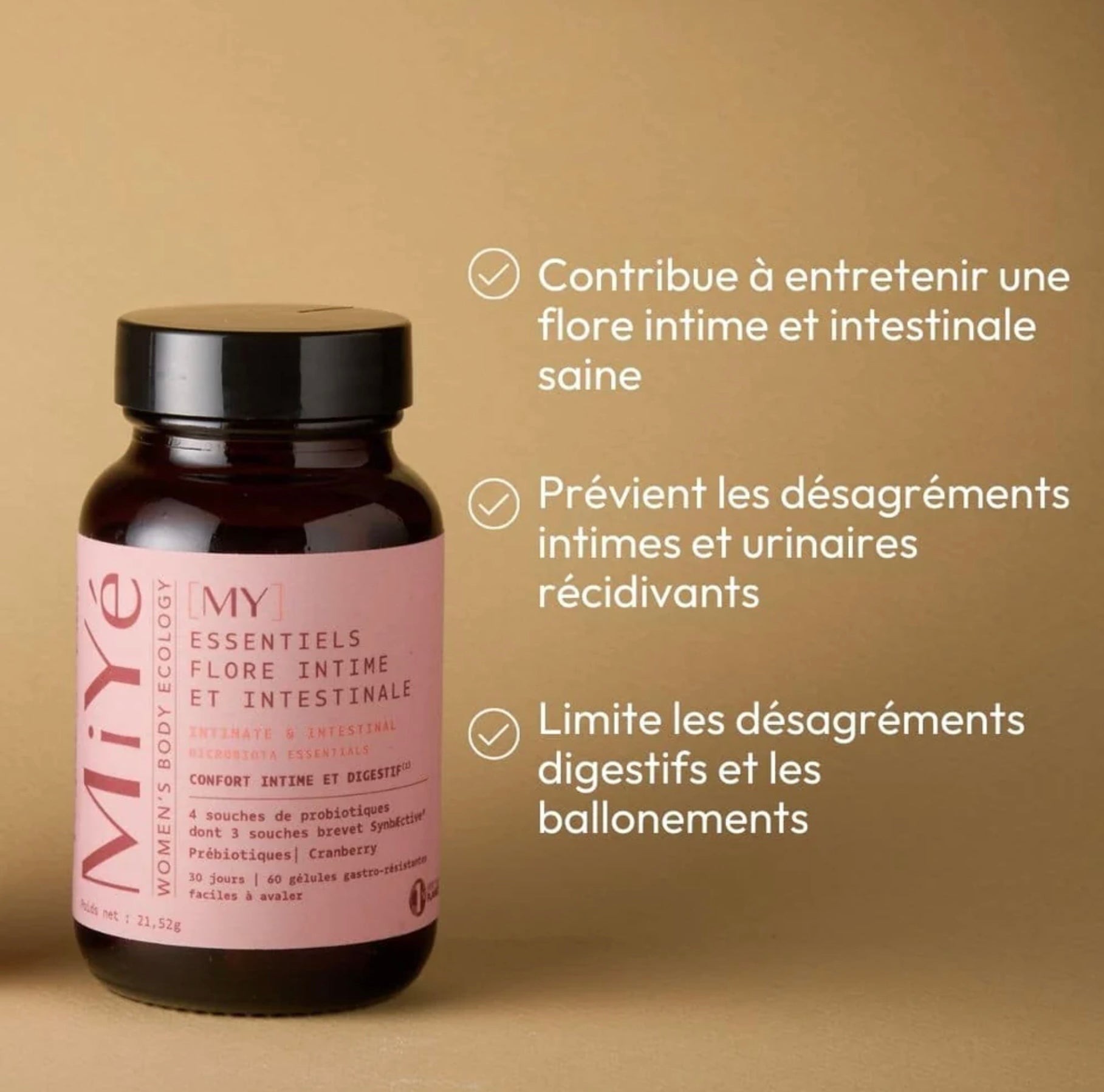 Synergie de prébiotiques et de 4 souches de lactobacilles et bifidobactéries brevetées SynbAEctive® soutenu par 3 essais cliniques, pour contribuer à un bon équilibre de la flore vaginale et intestinale, étroitement liées, et à prévenir la récidive des désagréments intimes.