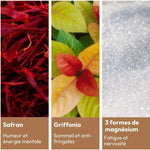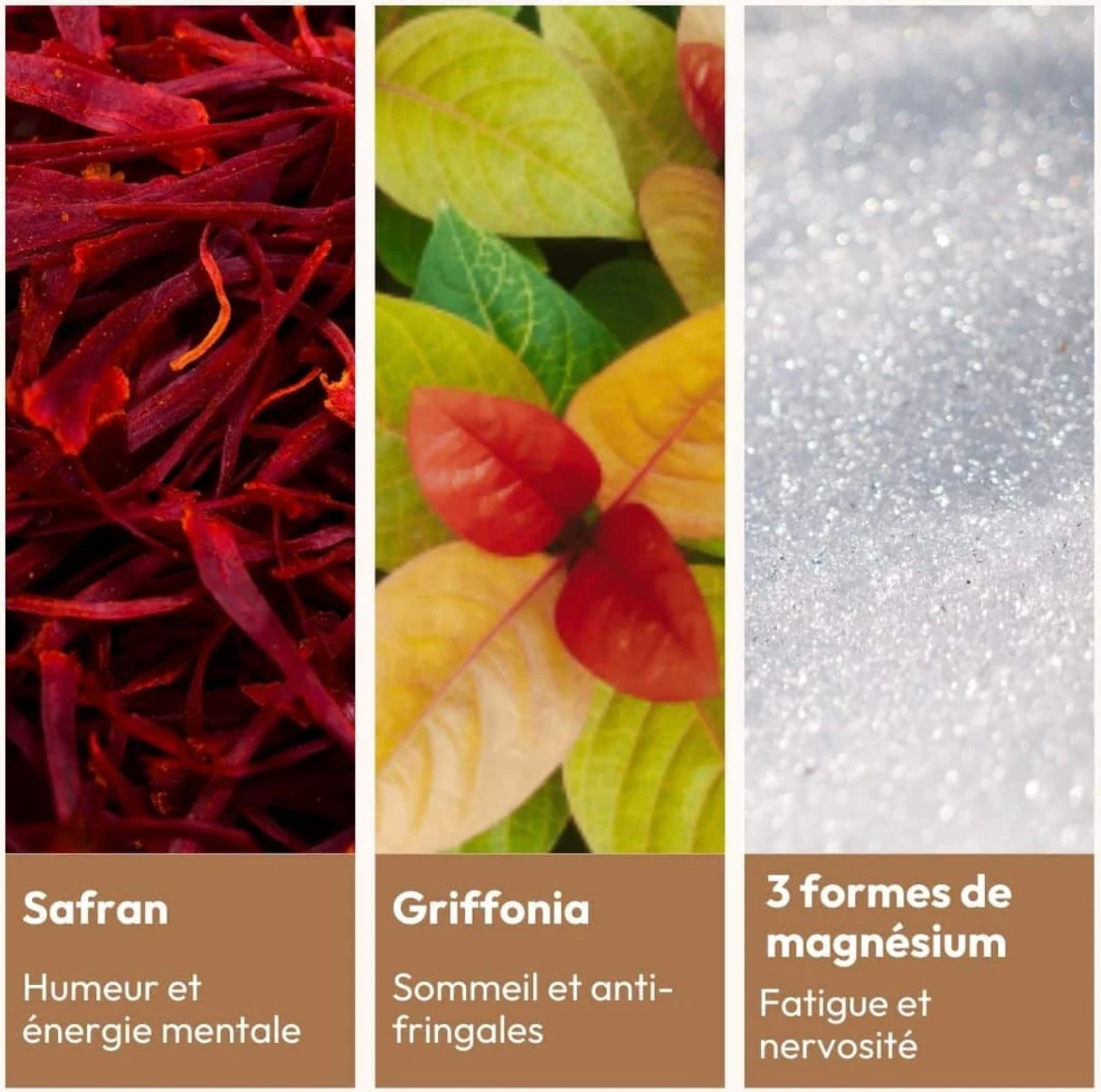 - 3 plantes adaptogènes synergiques (safran, griffonia, rhodiole)