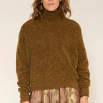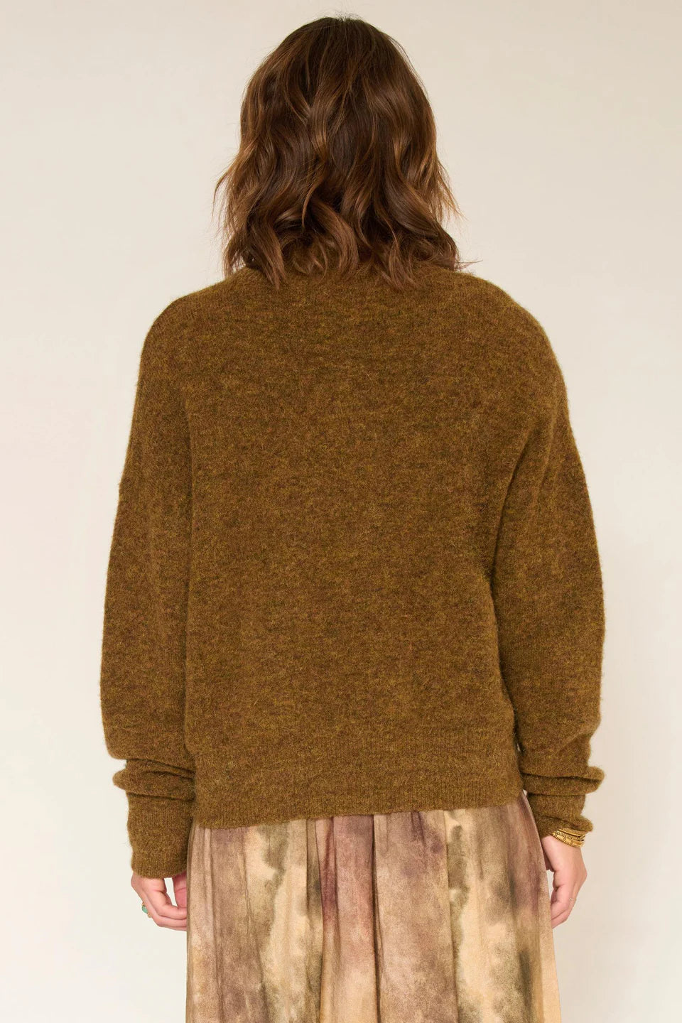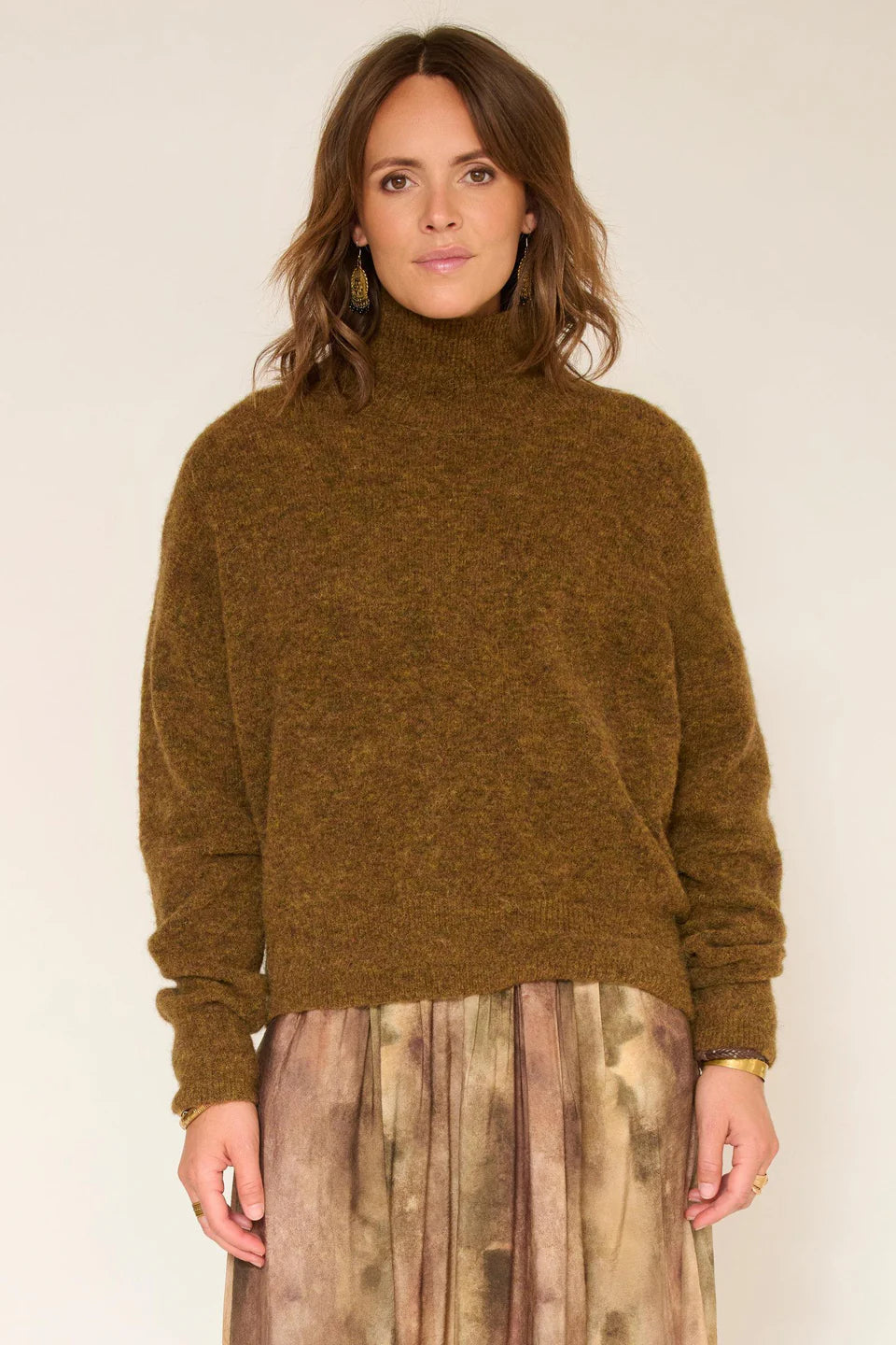 Fabriqué à partir d'un mélange de 32% alpaga, 32% laine mérinos, 30% polyamide et 6% élasthanne, ce pull offre une texture douce et légèrement duveteuse. Sa couleur kaki, qui évoque des tons terreux, lui confère une allure naturelle et intemporelle.