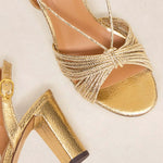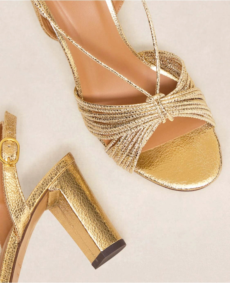 Confectionné en cuir de chèvre et en cuir bovin. Bout en amande. Fermeture à l’aide d'une boucle à ardillon ovale finition or clair. Doublure en cuir bovin et semelle jourdain en cuir. Tige en cuir de chèvre finition laminée craquelée provenant d'une tannerie espagnole. Fabriqué au Portugal dans le respect du savoir-faire traditionnel. Talon bloc enrobé en cuir de chèvre : 70 mm. Cordons en cuir faits à la main en Espagne. Arrière slingback et cordons qui remontent sur le côté du pied.