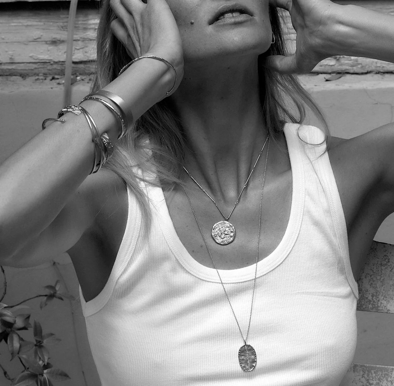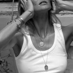 Sautoir du 68cm avec la médaille Bazile embossées, serties de zircons blancs, brossées, mates et dorées à l'or fin.