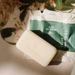 Le savon solide surgras Kerzon, riche en acides gras naturels, en beurre de karité et en huile d'amande douce bio, enveloppe la peau d’une mousse onctueuse et la parfume délicatement.