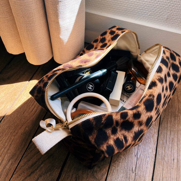 Trousse de toilette en velours léopard suffisamment grande pour contenir tout votre nécessaire de toilette pour courts ou longs séjours.