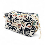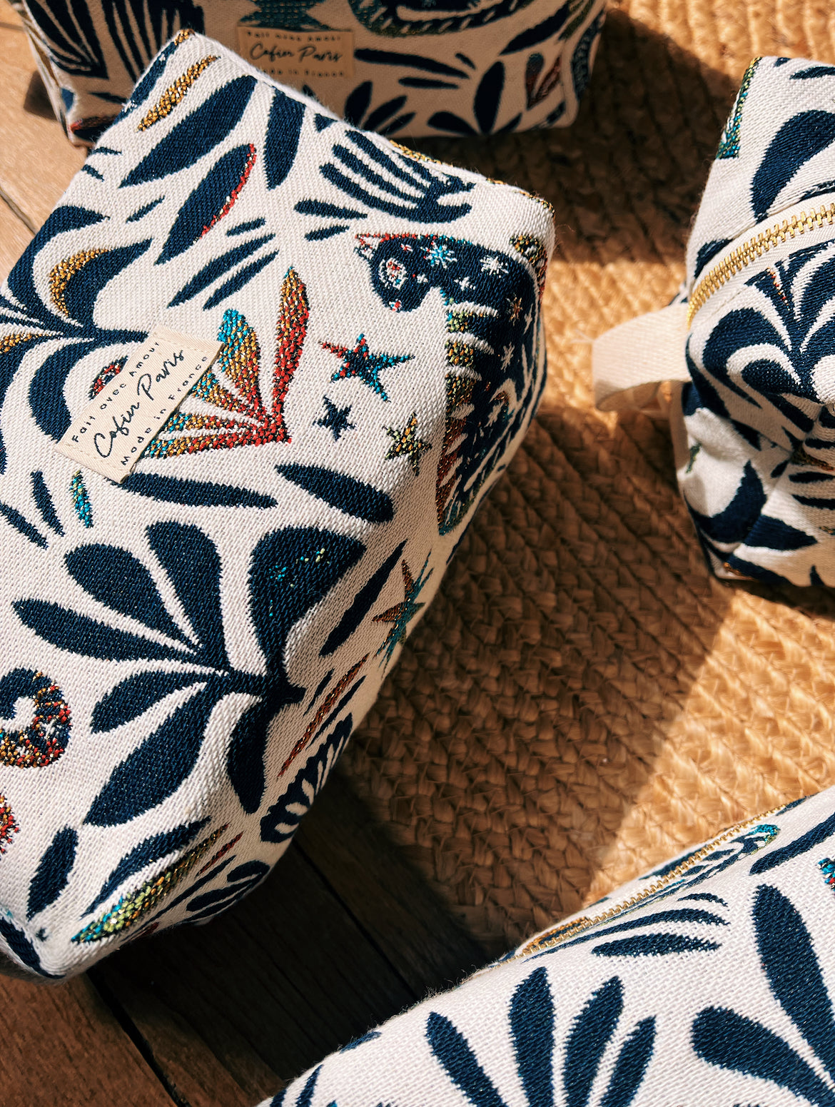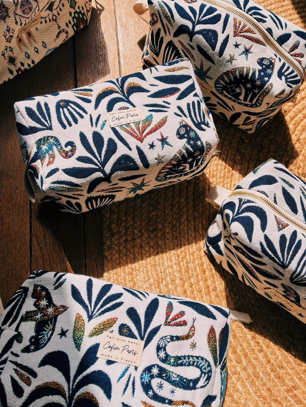 Trousse de toilette en tissu jacquard brodé suffisamment grande pour contenir tout votre nécessaire de toilette pour courts ou longs séjours.